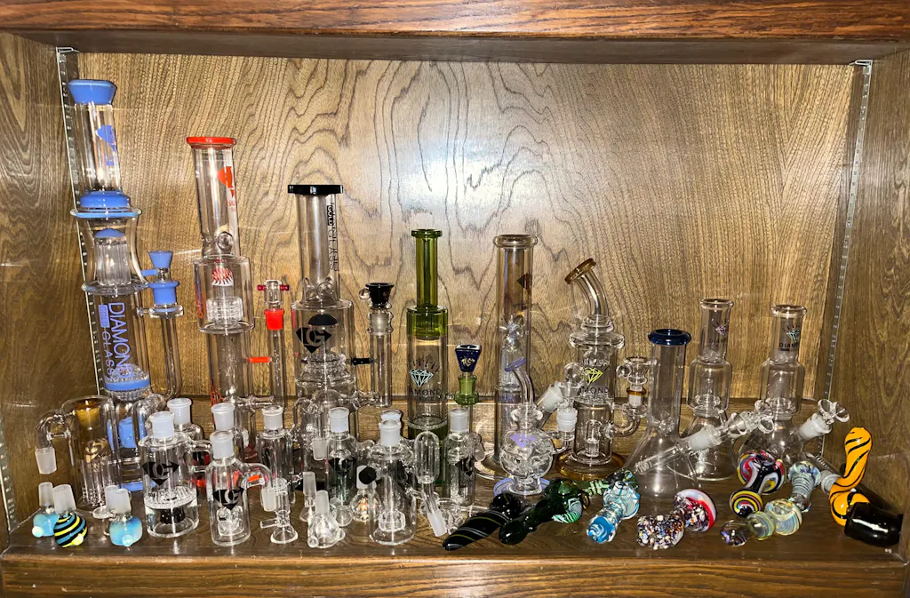 This is an extraordinary rig design by Diamond Glass. They packed so much into this 10 inch rig. There are two chambers starting with a built in stem that leads to a diffused 5 arm connected percolator at the bottom chamber. Your smoke is filtered through the bubbling action and travels up to the second 5 arm percolator. The top chamber offers a 5 arm tree perk, perfectly cut and wielded down to be more sturdy. The smoke is processed and filtered perfectly before it enters the bent neck mouth piece. Diamond Glass has added beautiful rims of color around the base, joint, and mouthpiece. It comes with a 14mm handle funnel bowl.